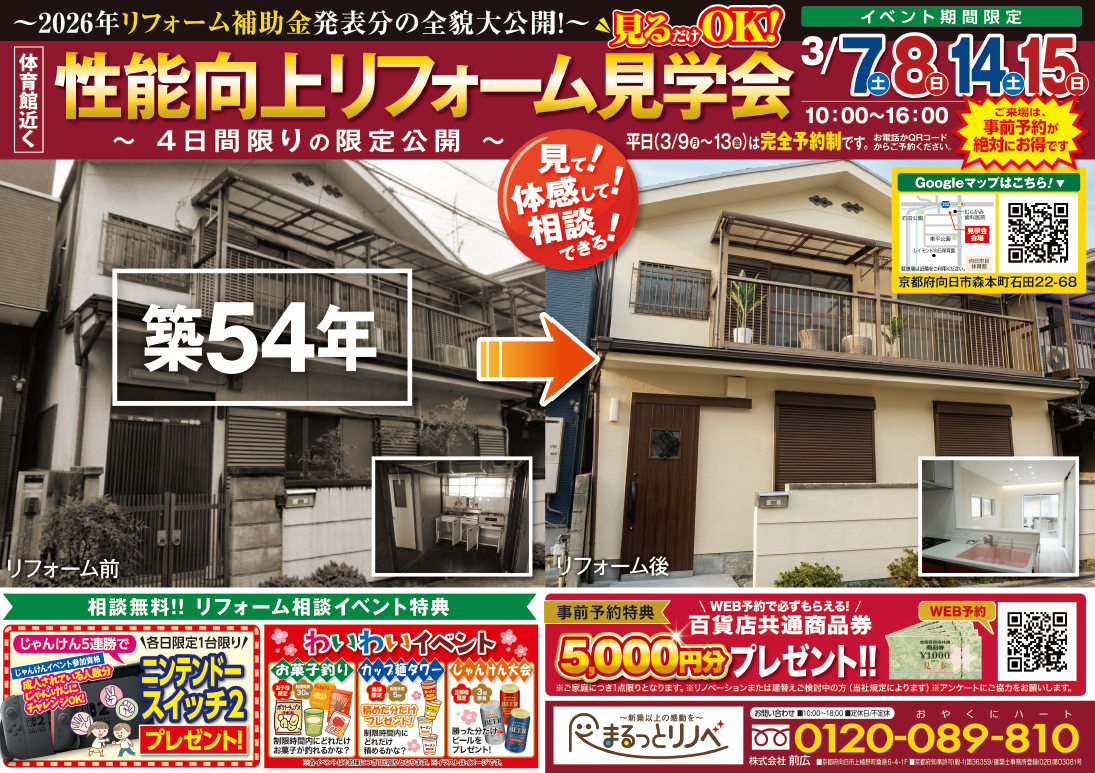 無料相談会施主宅見学会来場無料完成見学会 開催前 【3月7(土)~3月15(日)】性能向上リフォーム見学会